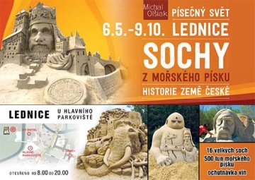 Všechny vás srdečně zvu na jedinečnou výstavu soch z mořského písku na téma HISTORIE ZEMĚ ČESKÉ. 16 velkých soch z 500 tun mořského písku a ochutnávka vín.
